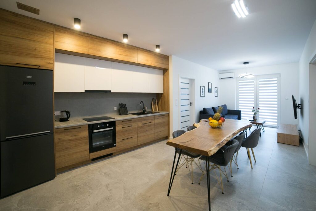 To komfortowe i eleganckie miejsce wykończone z najwyższą dbałością o szczegóły. Wyposażenie kuchni umożliwia samodzielne przygotowanie posiłku. Aneks kuchenny został wyposażony w najwyższej jakości sprzęty AGD: płytę indukcyjną, lodówkę z zamrażalką, zmywarkę, czajnik bezprzewodowy oraz komplet naczyń. W łazience znajduje się prysznic, wanna oraz pralka.